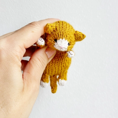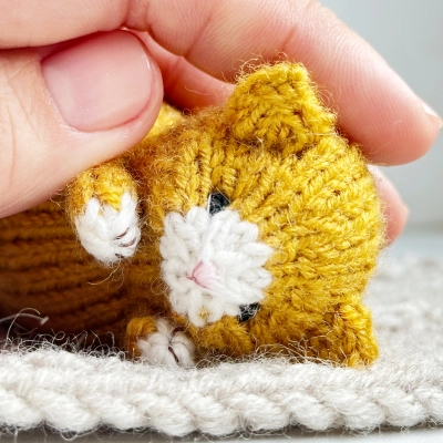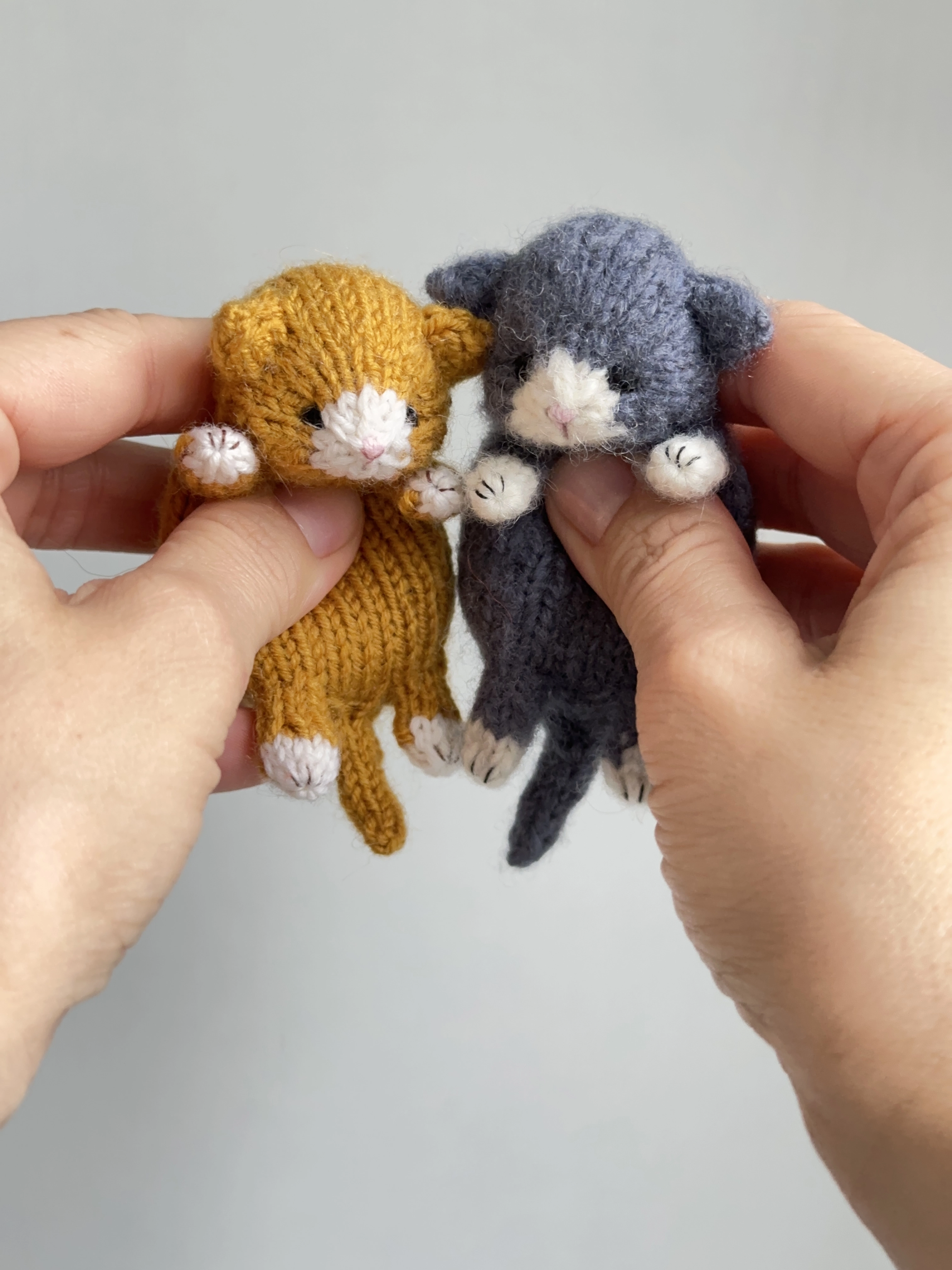 Пряжа: подойдет любая пряжа натуральных оттенков, которая нравится, но желательно, чтобы она была пушистая и немного объемная. Ориентируйтесь на метраж 300м/100г. Я вязала из Пехорки «Гламурная» (серый котик), GazzalAlpacaSupersoft (серо-бежевый пушистый котик самый крупный) и AlizeSuperlanaklasik – рыжая пряжа на фото процесса, она гладкая и на ней лучше видно петли.