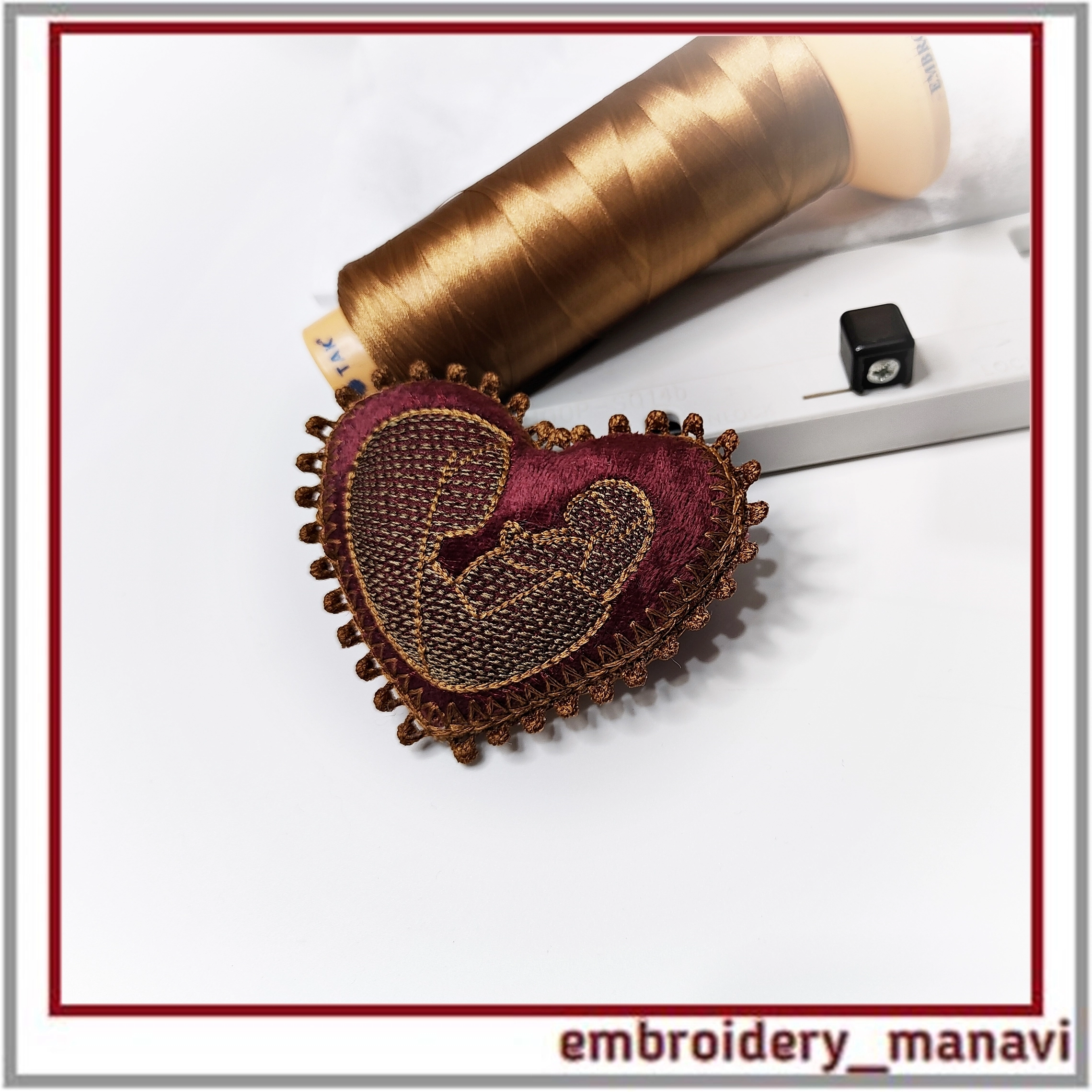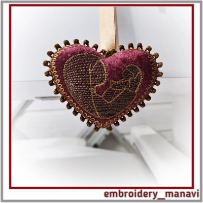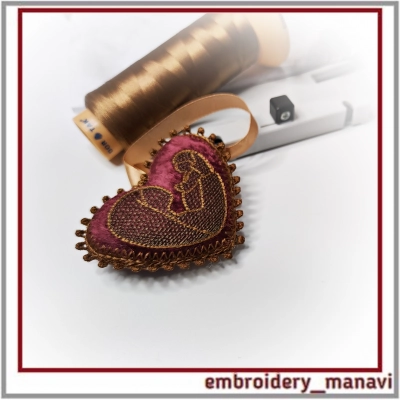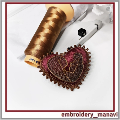 Дизайн для машинной вышивки. Подвеска-подушечка сердце с Мадонной и младенцем с кружевным краем. 2 запяливания в пяльцах 100 х 100 мм. Можно использовать дизайн как аппликацию.