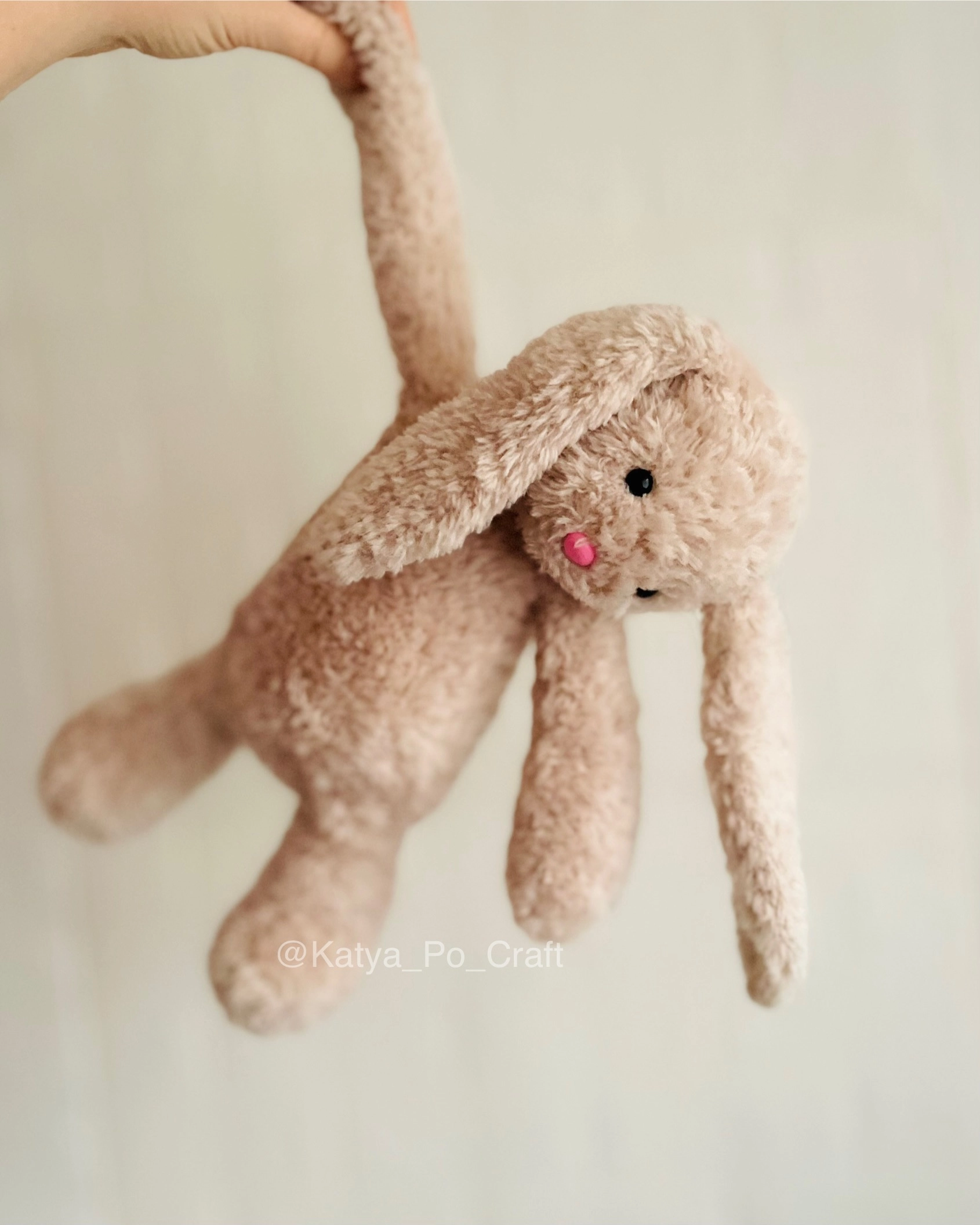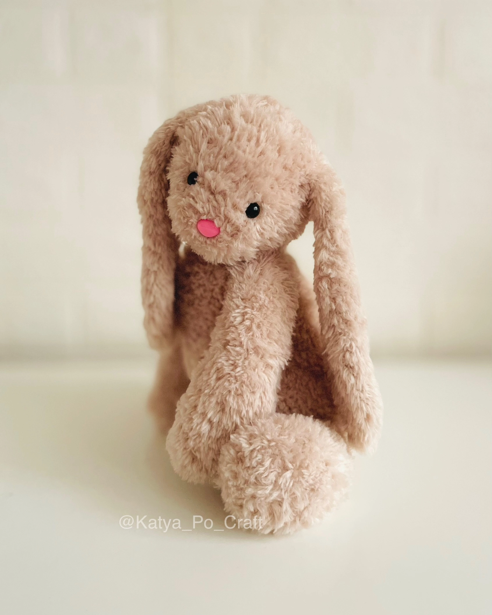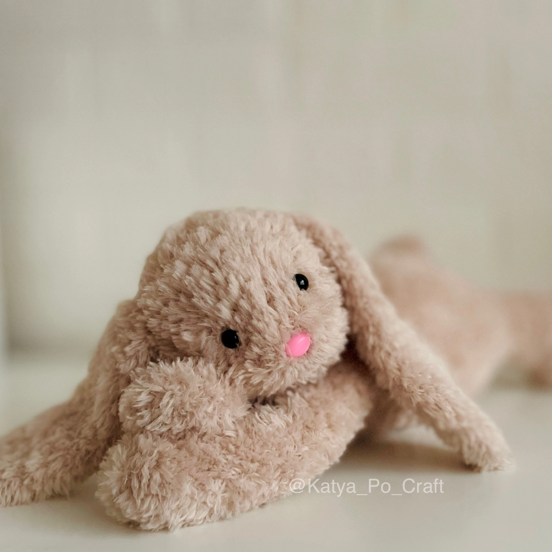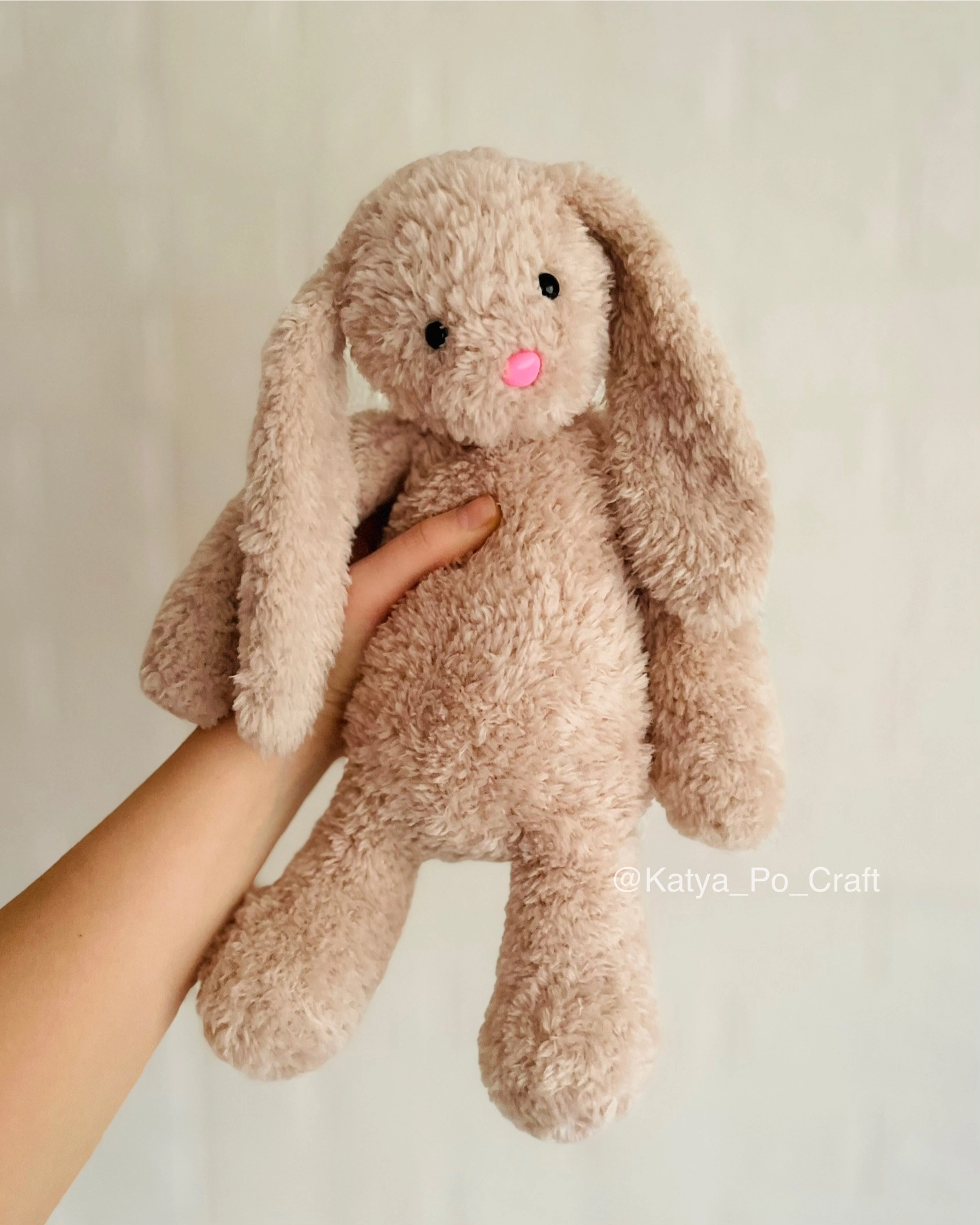 Мастер-класс в формате PDF содержит подробное текстовое описание вязания зайчика и фотографии ключевых моментов для ориентира. Голова и туловище зайки вяжутся одной деталью по кругу. Лапы, хвост и уши вывязываются из тела, в этой схеме нет укороченных рядов или пришивных деталей. Удобнее вязать круговыми спицами на леске методом magic loop, но можно так же использовать набор чулочных спиц. Размер готовой игрушки при использовании материалов, как у меня — около 39 см. Для создания эффекта плюша подойдет практически любая пушистая пряжа, в том числе букле или softy. Если вы будете вязать из гладкой пряжи, учитывайте, что зайчик получится более худым и длинным. Необходимые материалы и инструменты: — Пряжа YarnArt Mink (у меня цвет №331). Расход — около 2,5 мотков. — Круговые спицы на леске 2 мм или чулочные спицы. — Маркеры для вязания, булавки для вязания или английские булавки. — Глазки и носик на безопасном креплении, подходящие по размеру (у меня глазки 10 мм и носик 15 мм). — Наполнитель холлофайбер/синтепух. — Ножницы. — Игла с тупым концом и широким ушком для пряжи. — Булавки портновские. — Крючок 2-3 мм для поднятия петель. — Металлическая щетка или пуходерка для начесывания.