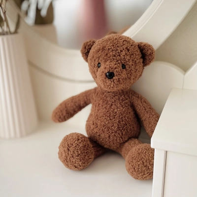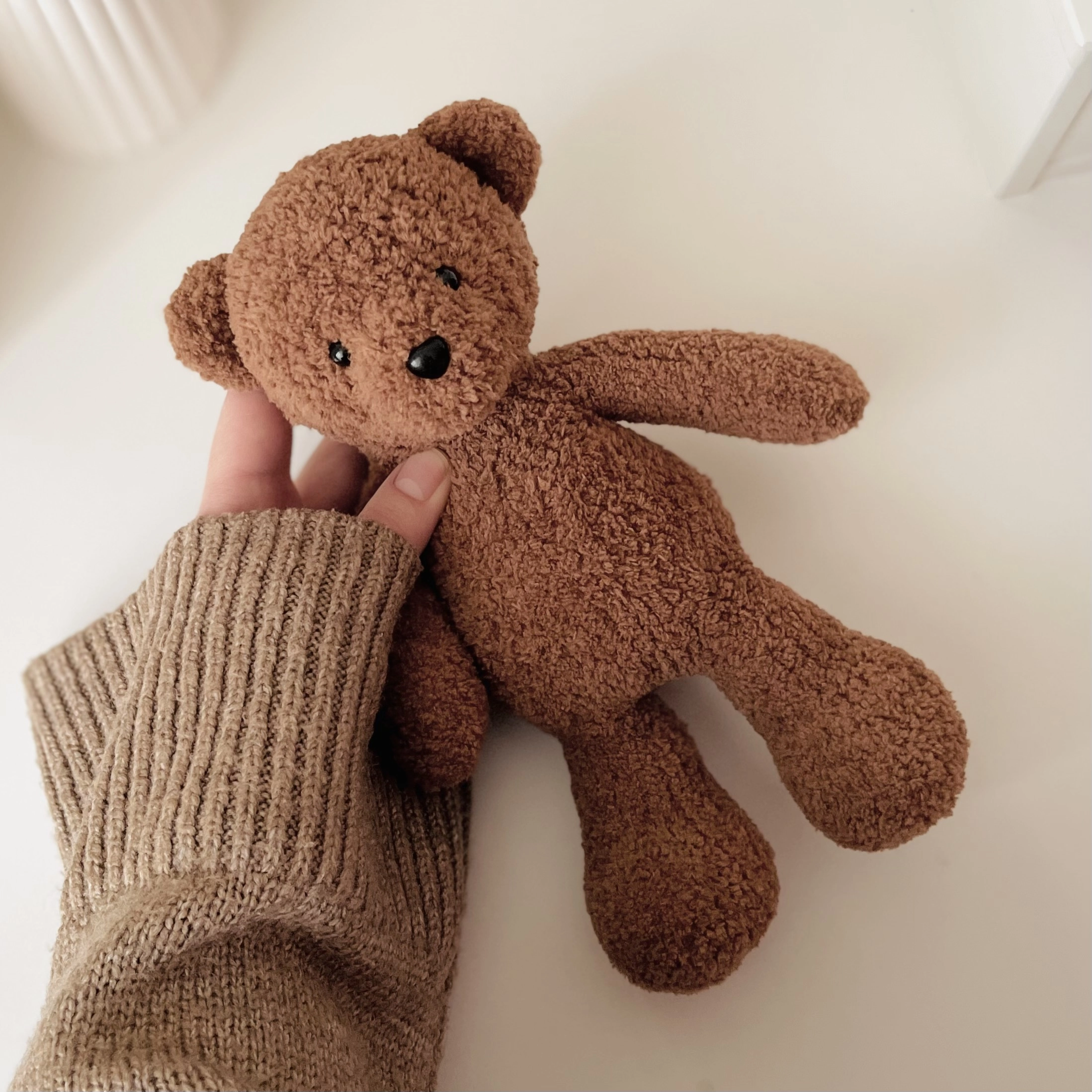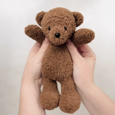 Мастер-класс в формате PDF содержит подробное текстовое описание вязания мишки и фотографии ключевых моментов для ориентира. Голова и туловище мишки вяжутся одной деталью по кругу с помощью укороченных рядов. Лапы, и хвост вывязываются из тела, пришиваются только ушки. Удобнее вязать круговыми спицами на леске методом magic loop, но можно так же использовать набор чулочных спиц. Размер готовой игрушки при использовании указанных материалов — около 25 см. Для создания эффекта плюша подойдет практически любая пушистая пряжа, в том числе букле. Если вы будете вязать из гладкой пряжи, учитывайте, что мишка получится более худым. Необходимые материалы и инструменты: — Пряжа Alize Baby Softy (у меня цвет №321). Расход — меньше одного мотка. — Круговые спицы на леске 2 мм или чулочные спицы. — Маркеры для вязания, булавки для вязания или английские булавки. — Глазки и носик на безопасном креплении, подходящие по размеру (у меня глазки 8 мм и носик 11 мм). — Наполнитель холлофайбер/синтепух. — Ножницы. — Игла с тупым концом и широким ушком для пряжи. — Булавки портновские. — Крючок 2-3 мм для поднятия петель.
