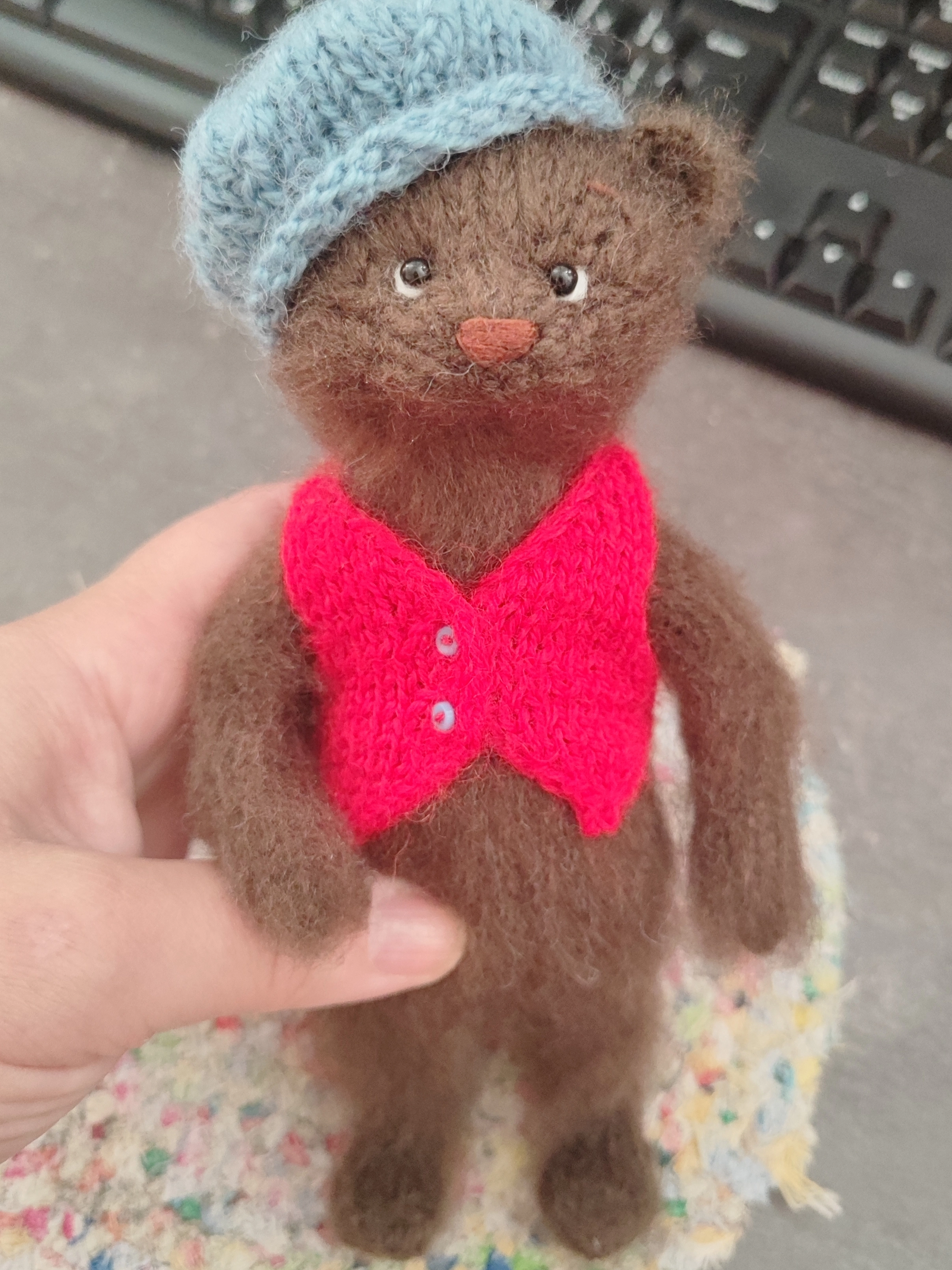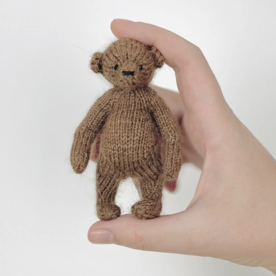 При вязании из тонкой пряжи 150м/50г спицами 1,5 мм, рост мишки будет около 10,5 см. Из более толстой пряжи, например 250м/100г, спицами 2 мм мишка получится около 16 см.