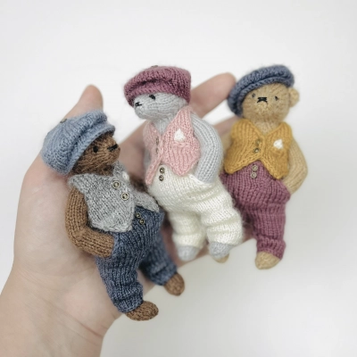Мастер-класс по вязанию мини мишки в костюмчике в формате PDF. Включает в себя 4 описания вязания:
