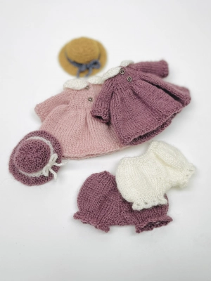 Все элементы одежды вяжутся по кругу без швов сверху вниз, только верх платья вяжется поворотными рядами, затем полочки соединяются.