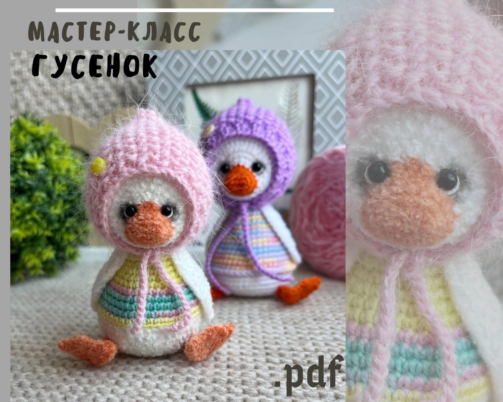 Гусь связан крючком, шапка на двух спицах. Шапку можно связать также крючком наподобие из мастеркласса, связав при этом прямоугольник.