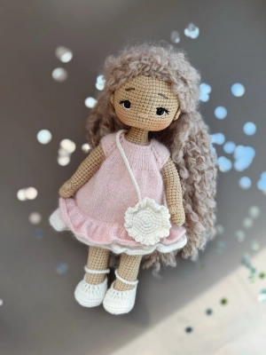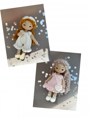 В описание входит: комбинезон, повязка на голову, платье связанные спицами (пух норки), сумочка и два вида туфелек- крючком;