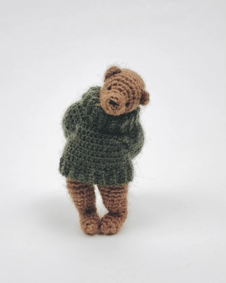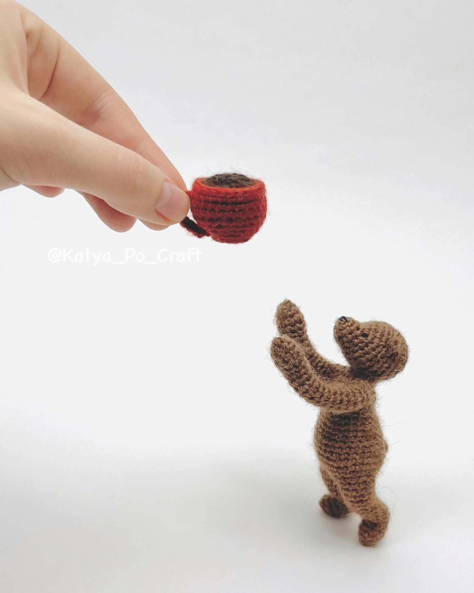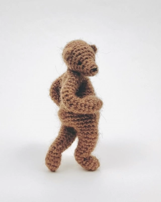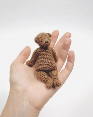 Мишка вяжется по спирали без швов и набивается в конце вязания после установки каркаса с помощью тонкой деревянной палочки. Размер готовой игрушки при использовании указанных материалов — около 11см.