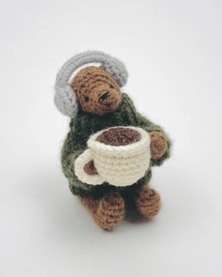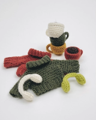 Свитер вяжется по кругу регланом сверху без швов, наушники и чашка вяжутся по спирали. Аксессуары подходят для игрушек ростом до 11см при использовании указанных материалов.