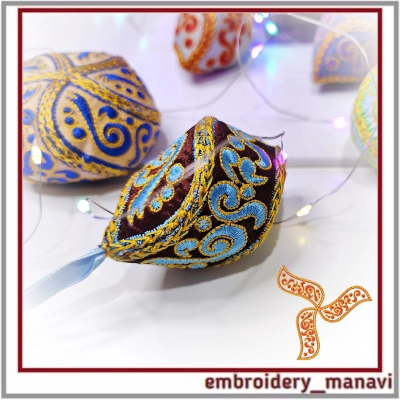 Дизайн для машинной вышивки. Ёлочные игрушки. Набор из 4-х дизайнов. Набор состоит из дизайнов содержащих 1 элемент( 73 х 73 мм), 3 элемента( на фото это винтовая сосулька, 150 х 150 мм.), 4 элемента ( по форме приближается к шару, 174 х 174 мм.) и 5 элементов ( по форме более плоский шар или бискорню, 167 х 167 мм.) Во всех дизайнах основной элемент одного размера. Пошаговая инструкция. Не сложная вышивка и сборка. Красивое украшение на ёлку или в подарок. Так же может быть использована и как бискорню-игольница.