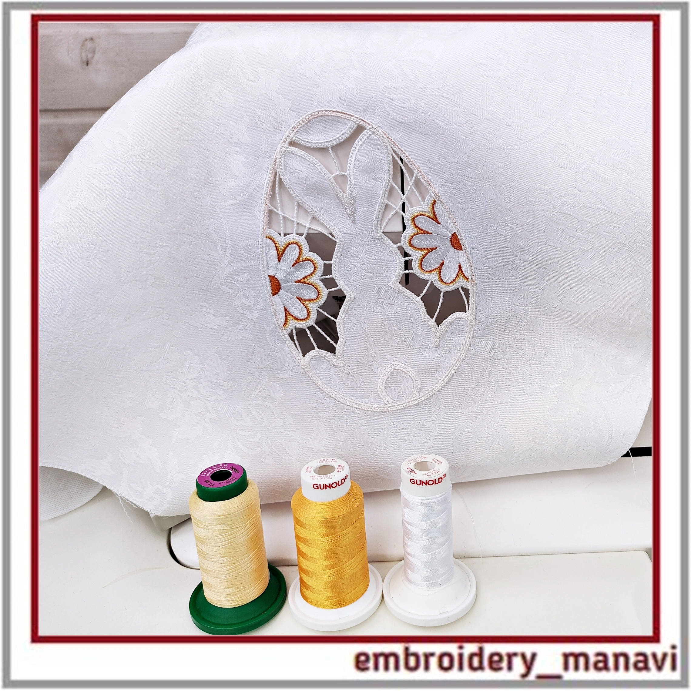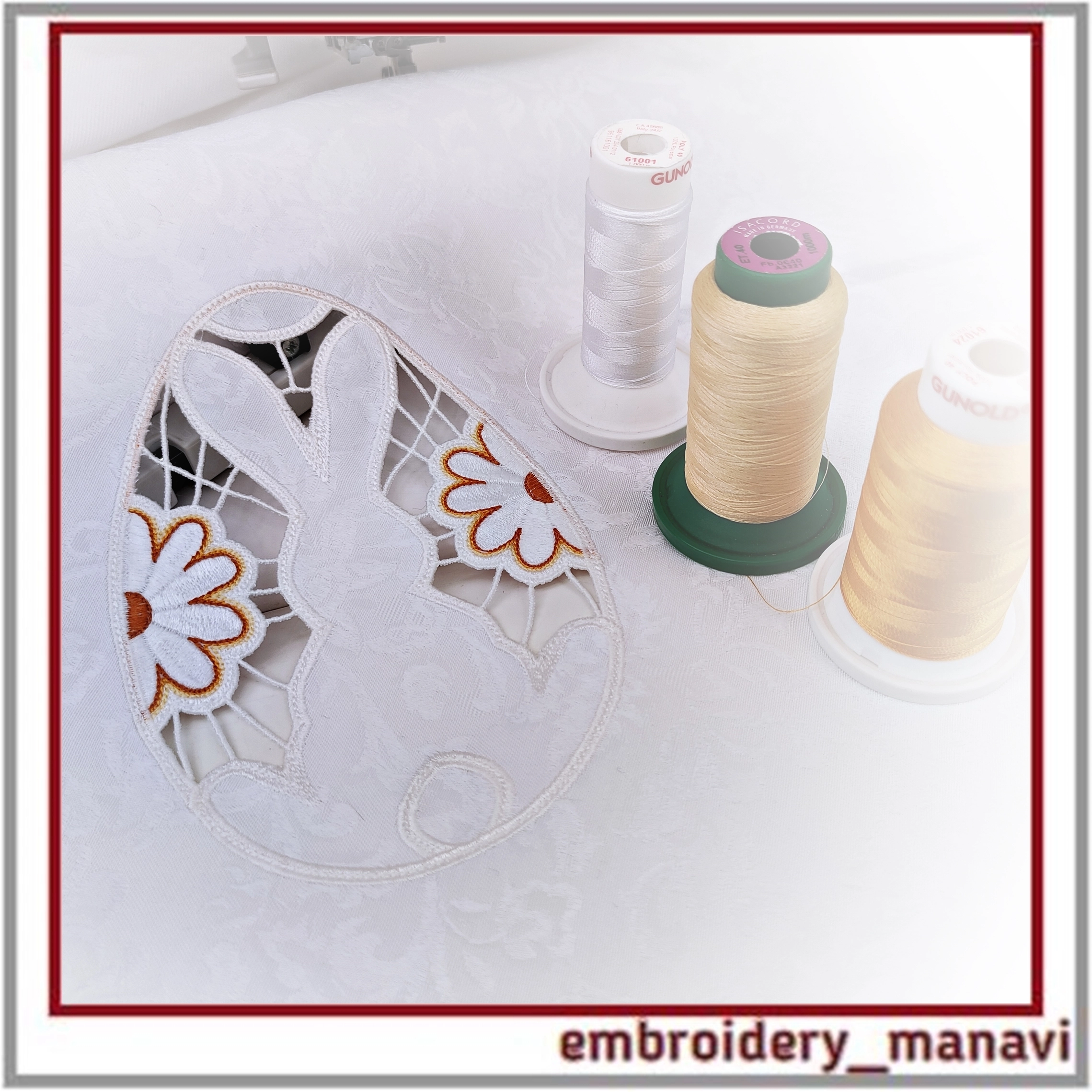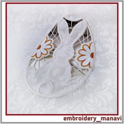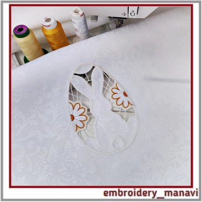 Дизайн для машинной вышивки. Ришелье Пасхальный кролик с ромашками. Размер дизайна 133 х 133 мм. Замечательно для пасхальной салфетки, полотенец, скатерти и пр.